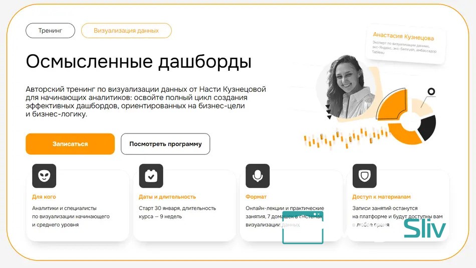 Авторский тренинг по BI от Насти Кузнецовой для начинающих аналитиков: освойте полный цикл создания эффективных дашбордов, ориентированных на бизнес-цели и бизнес-логику.