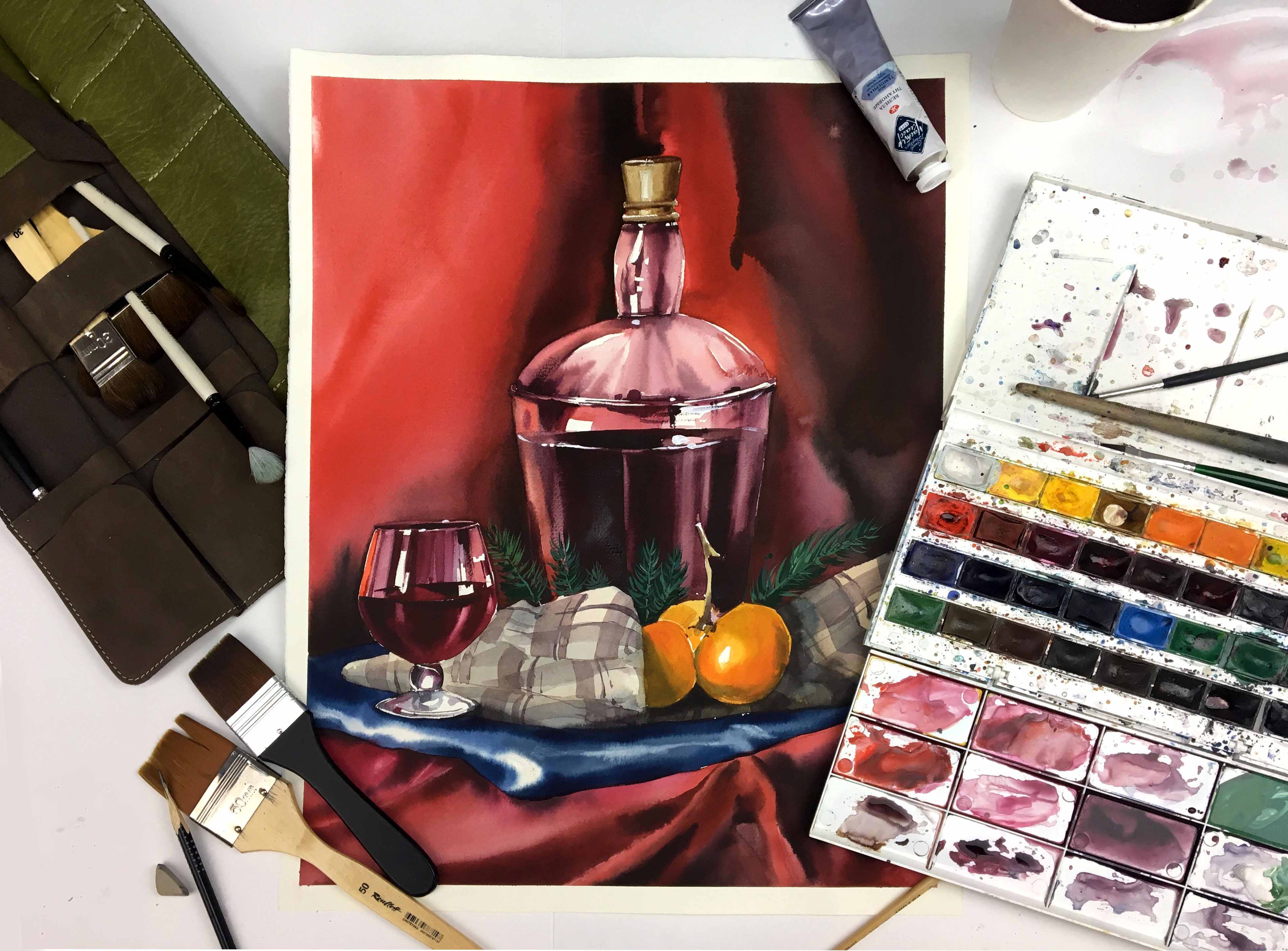 С Рождественского сочельника и до Крещения русский народ широко гуляет Святки - "святые вечера". Это время рождественской радости и подготовка к следующему празднику. В один из таких вечеров предлагаем вам окунуться в атмосферу праздничного застолья и создать прекрасный акварельный натюрморт. Благородный красный, блеск стекла, живая зелень - всё это не оставит равнодушным ни одного акварелиста. Специально для данного мастер-класса мы создали уникальный референс-постановку, который позволит вам рассмотреть натуру с разных ракурсов и выбрать интересный именно для вас. А наш талантливый преподаватель, Дарья Куцаева, покажет, как передать всю красоту натуры в своей работе.