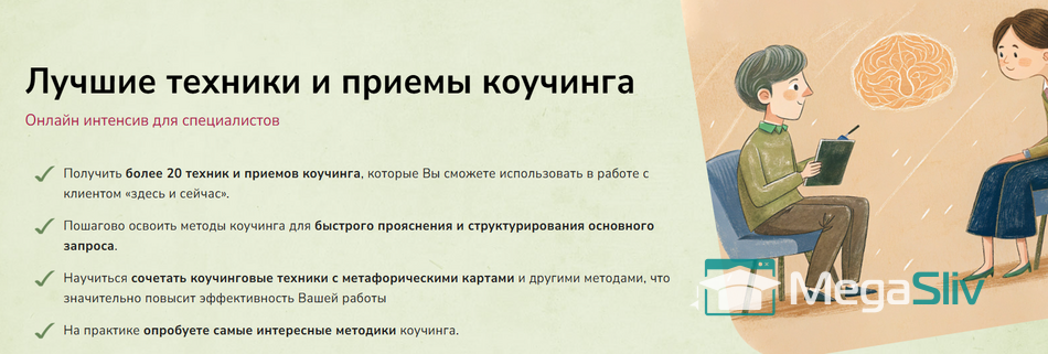 - Получить более 20 техник и приемов коучинга, которые Вы сможете использовать в работе с клиентом «здесь и сейчас».