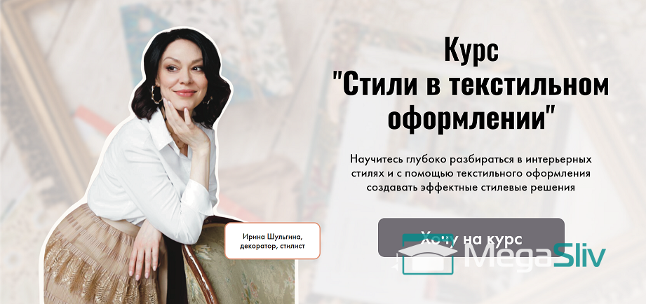 - Курс создан специально для текстильных декораторов. Каждый урок построен по схеме: особенности и характеристики стиля, ткани, модели штор и орнаменты, сегодняшняя интерпретация стиля, с какими стилями его можно миксовать.