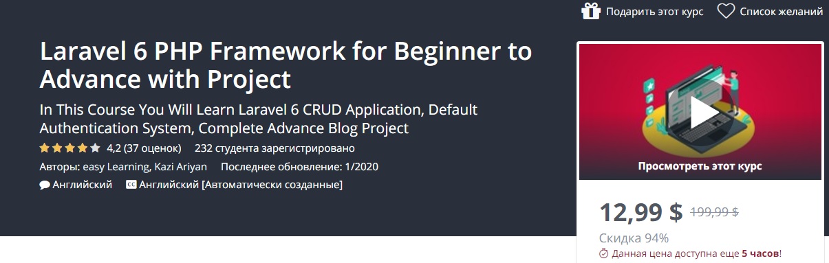 Один из лучших базовых курсов Laravel 6 по Udemy.