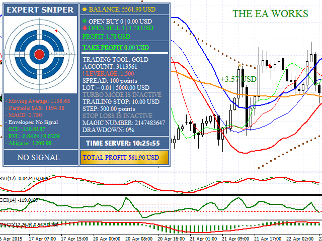 Торговый робот Снайпер (Sniper). Использует в работе 7 торговых индикаторов и множество различных механизмов, управляющих торговым процессом! Все используемые для получения сигнала индикаторы известны - это Parabolic SAR, MACD, MA, Envelopes, CCI, RVI, Alligator! Советник постоянно анализирует и держит под контролем любую рыночную ситуацию. Предназначен для полностью автоматической торговли! Каждый ордер поддерживается двойной безопасной сеткой с очень плавным мартингейлом. Для уменьшения рисков старайтесь не ставить высокий первоначальный лот! Рекомендуемый депозит - от 50$ на центовом, и от 500$ - на долларовом счете. При регистрации счета выбирайте самое большое кредитное плечо (лучший вариант 1:1000). Торговать нужно на таймфреймах от H1, где лучше прослеживаются тренд/флет и откаты.
