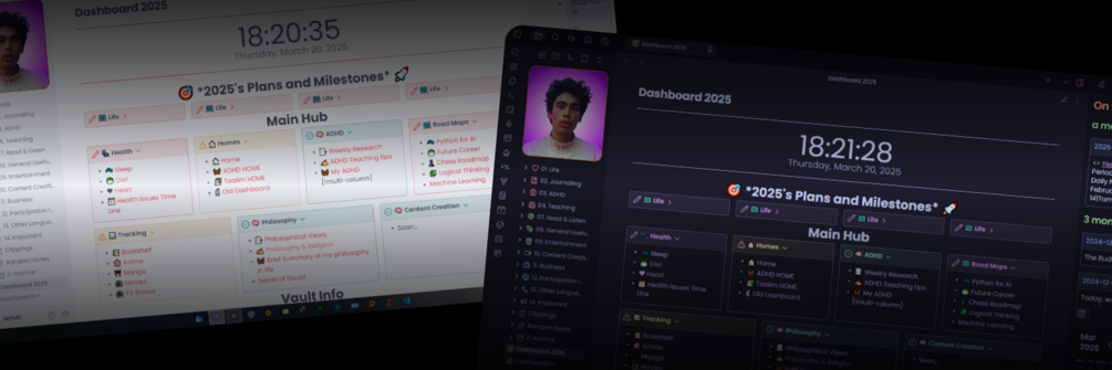 - Journaling: Daily Journaling: Я использую плагины Calendar и Periodic Notes для создания ежедневных, еженедельных, ежемесячных и годовых записей. Это помогает мне рефлексировать над мыслями, задачами и опытом.