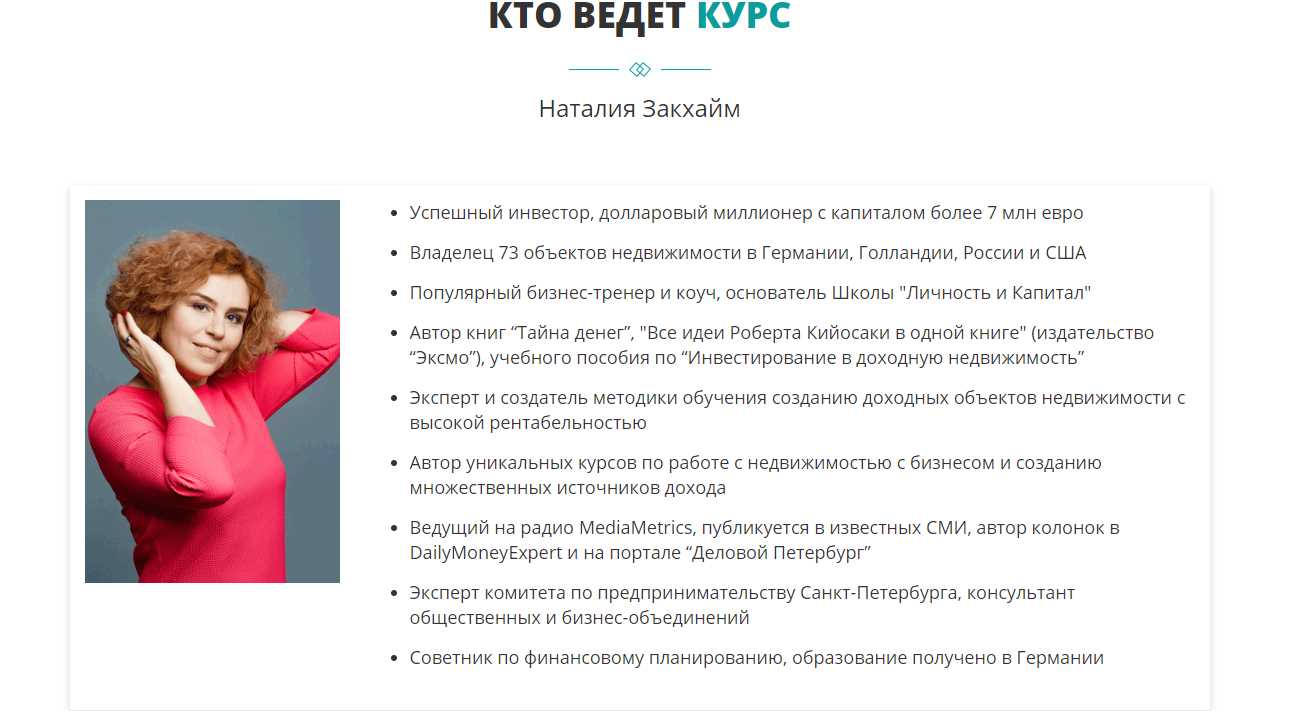 Вы знаете меня как эксперта в недвижимости, бизнесе, финансах и международного инвестора. И уже 7 лет я являюсь успешным продюсером в интернете. Я основала Школу «Личность и капитал» и успешно продюсирую специалистов разных профессий: инвестиции, недвижимость, доходные сайты, аукционы по банкротству, финансовая грамотность, а также психология, ораторское мастерство, отношения и многие другие.