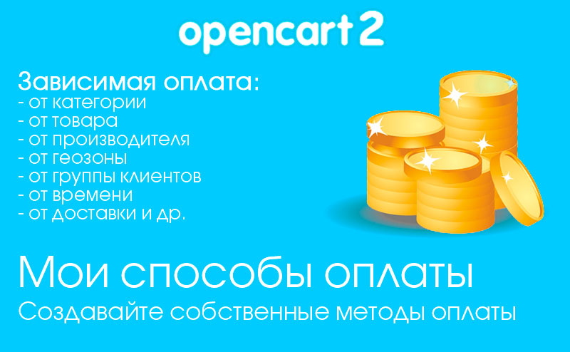 Модуль позволяет создавать сколько угодно новых способов оплаты, которые могут быть зависимые от всяческих параметров и факторов заказа. Модуль Мои способы оплаты для Opencart 2 позволит настроить оплату на сайте под себя.